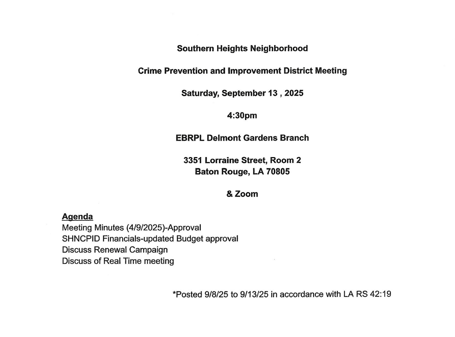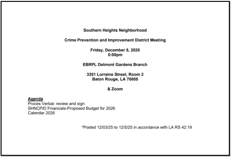 | Thursday, Feb 6, 2025 6 pm Delmont Library & via Zoom 3351 Lorraine St, Rm 2 Baton Rouge, LA 70805 | Prior Meeting Minutes March 20, 2024 September 5, 2024 December 18, 2024 2025 Proposed Budget with 2024 Financials **Proposed 2025 Budget Book **as if 12-17-24 | Meeting Flyer & Agenda Meeting Minutes |