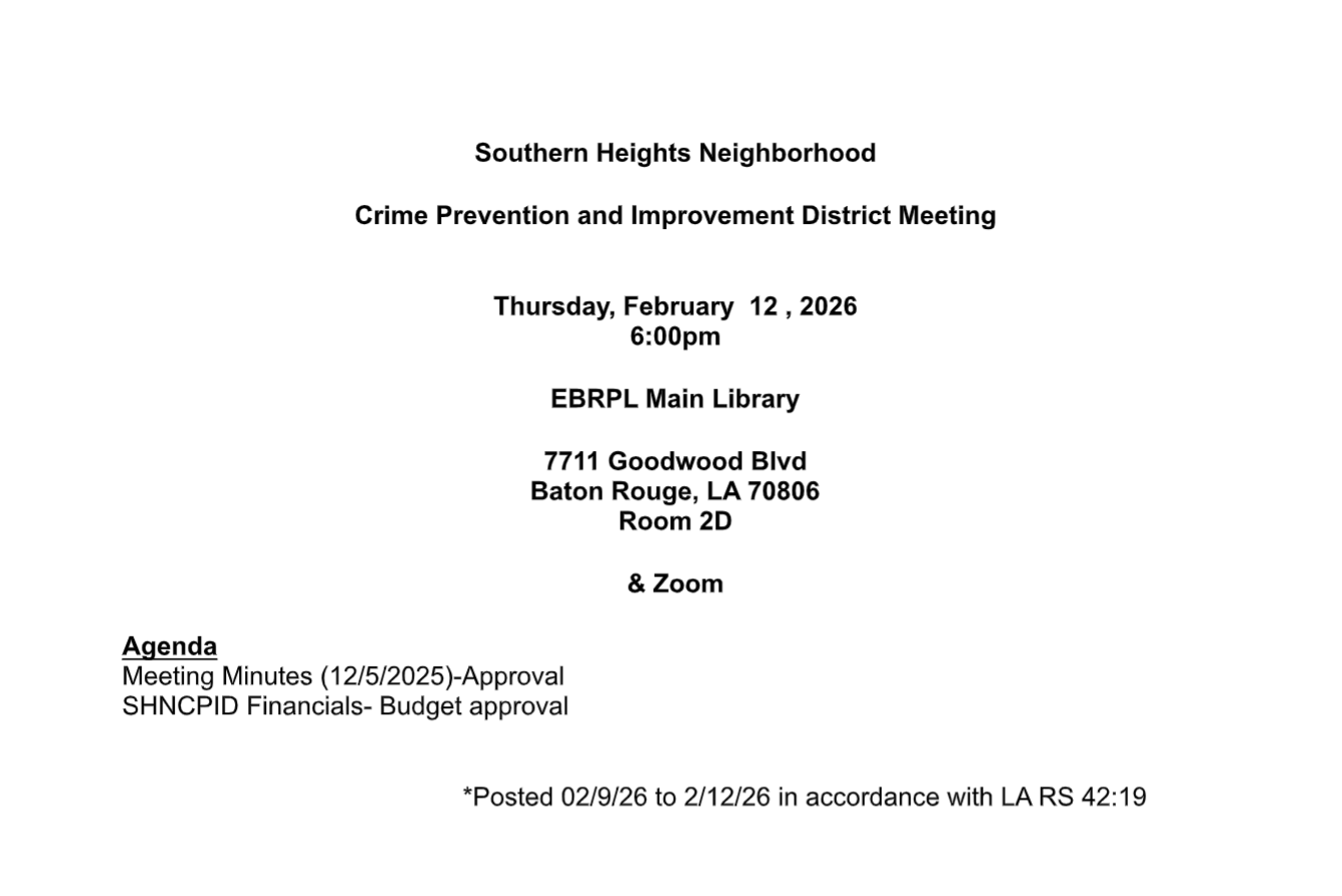 | Tuesday, May 7th Board Meeting @ 6:30 pm Scotlandville Library & Zoom 7373 Scenic Hwy Baton Rouge, LA 70807 Computer or Smartphone Access: Zoom Link Audio Only Access: 346-248-7799 Meeting ID: 836 9177 8844 Passcode: 186778 | Meeting Flyer Agenda Meeting Minutes Meeting Documentation Q1 2024 Financial Report SH Traffic Study |
